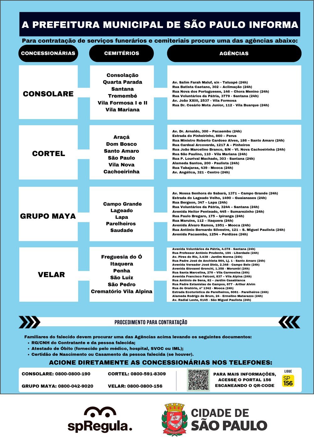 Buscando garantir o direito dos cidadãos e das Entidades da sociedade civil, referente à adequada prestação dos serviços funerários e cemiteriais na cidade de São Paulo, a SP-Regula reforça que as reclamações e denúncias relacionadas à prestação dos serviços pelas Concessionárias deverão ser registradas no Portal 156 da Prefeitura Municipal de São Paulo.